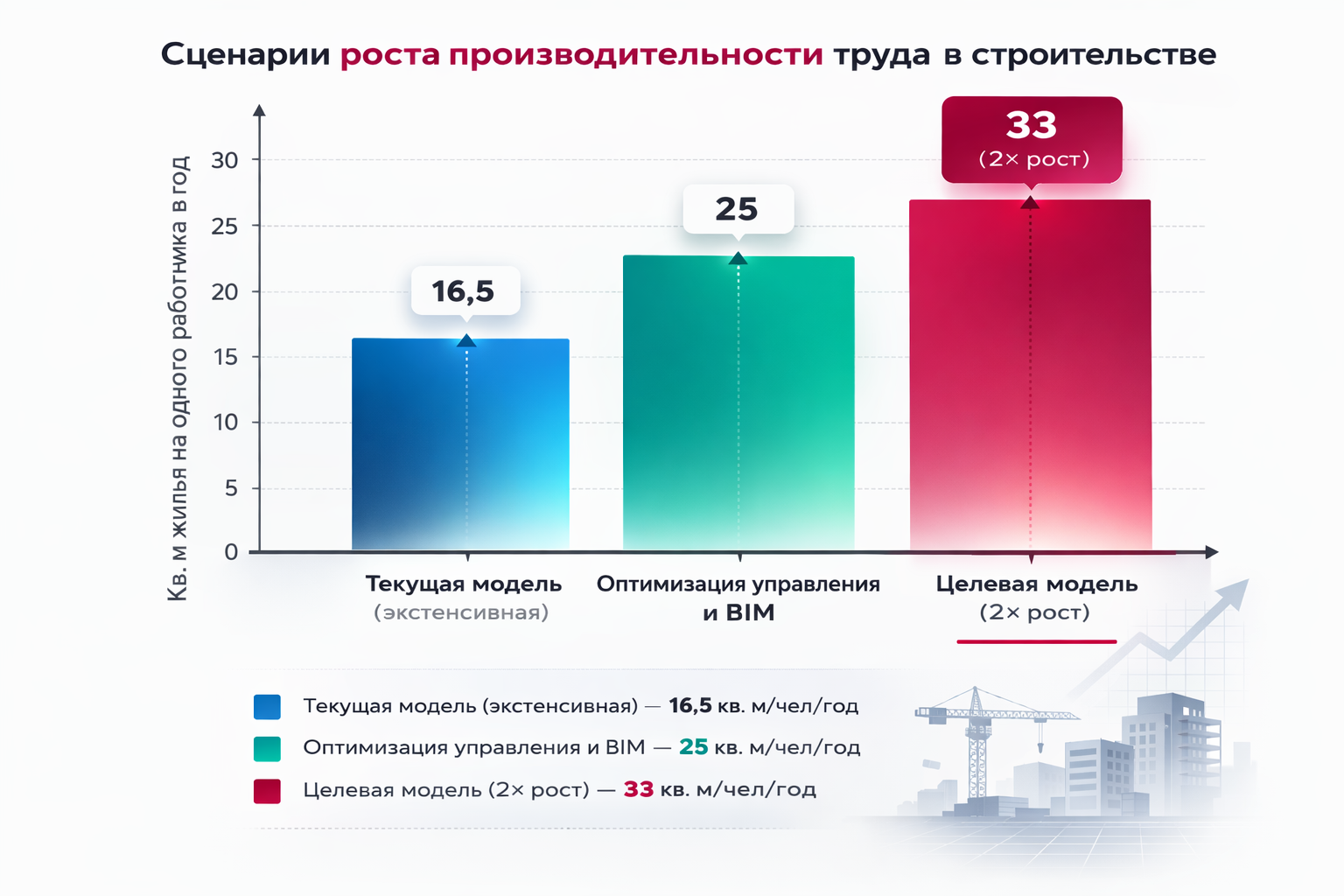 - Условная производительность: ≈ 16,5 кв. м жилья в год на одного работника