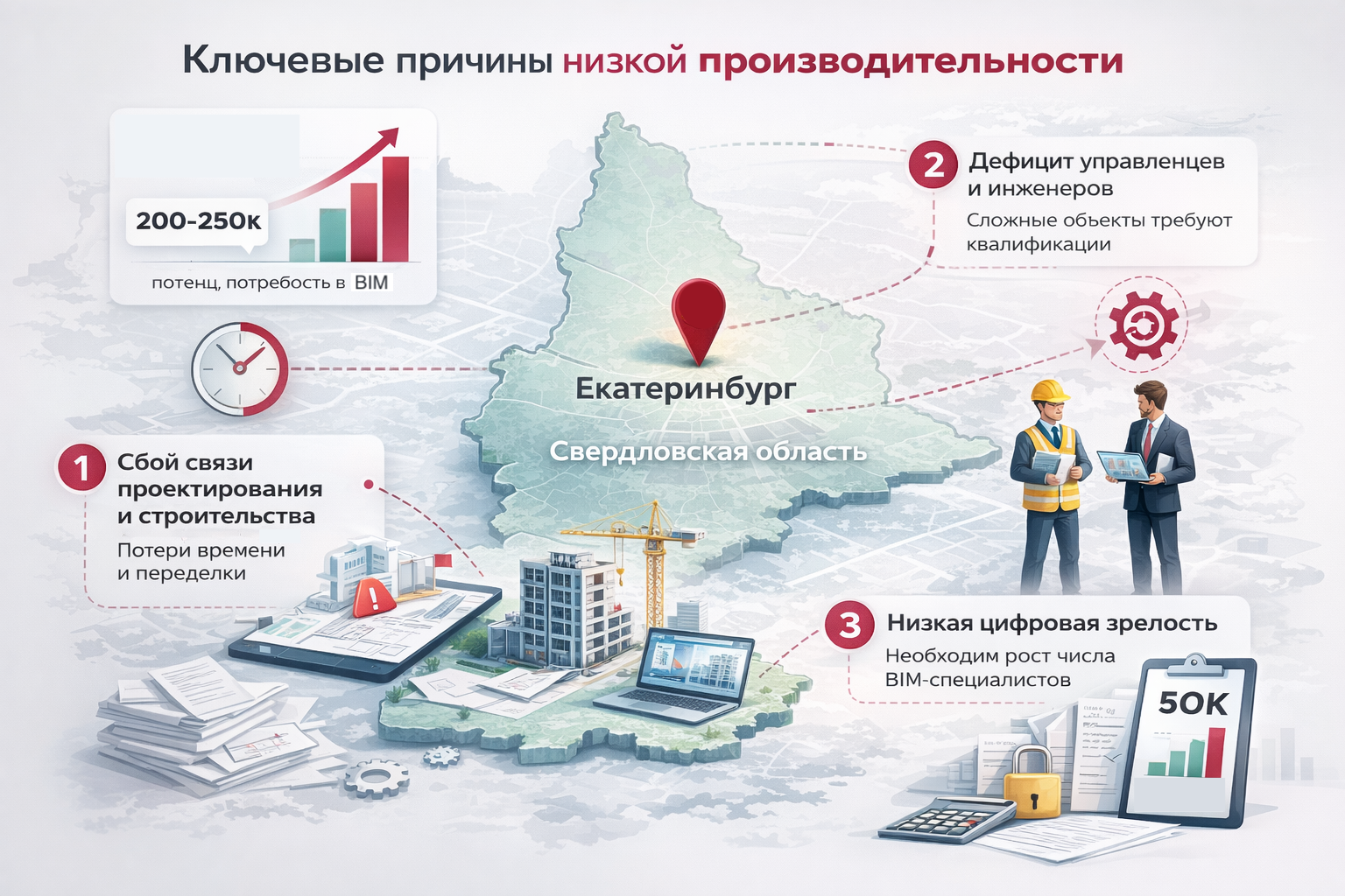 Ключевые причины низкой производительности носят системный характер. Во-первых, сохраняется разрыв между стадиями проектирования и строительства: проектные решения часто не учитывают реальные условия реализации, что приводит к переделкам, потерям времени и удорожанию проектов. Во-вторых, отрасль испытывает острый дефицит управленческих и инженерных компетенций - прежде всего главных инженеров проектов и руководителей проектов, способных управлять сложными объектами на всём жизненном цикле. В-третьих, уровень цифровой зрелости остаётся недостаточным: по оценкам отраслевых экспертов, строительному рынку уже сегодня требуется не менее 50 тыс. специалистов, владеющих BIM-технологиями, а потенциальная потребность оценивается в 200–250 тыс. человек. Наконец, во многих компаниях управление по-прежнему строится вокруг отдельных опытных сотрудников, а не вокруг выстроенных процессов.